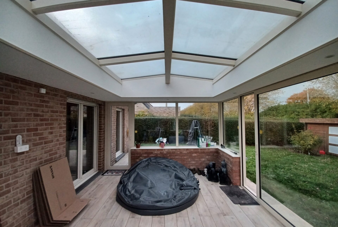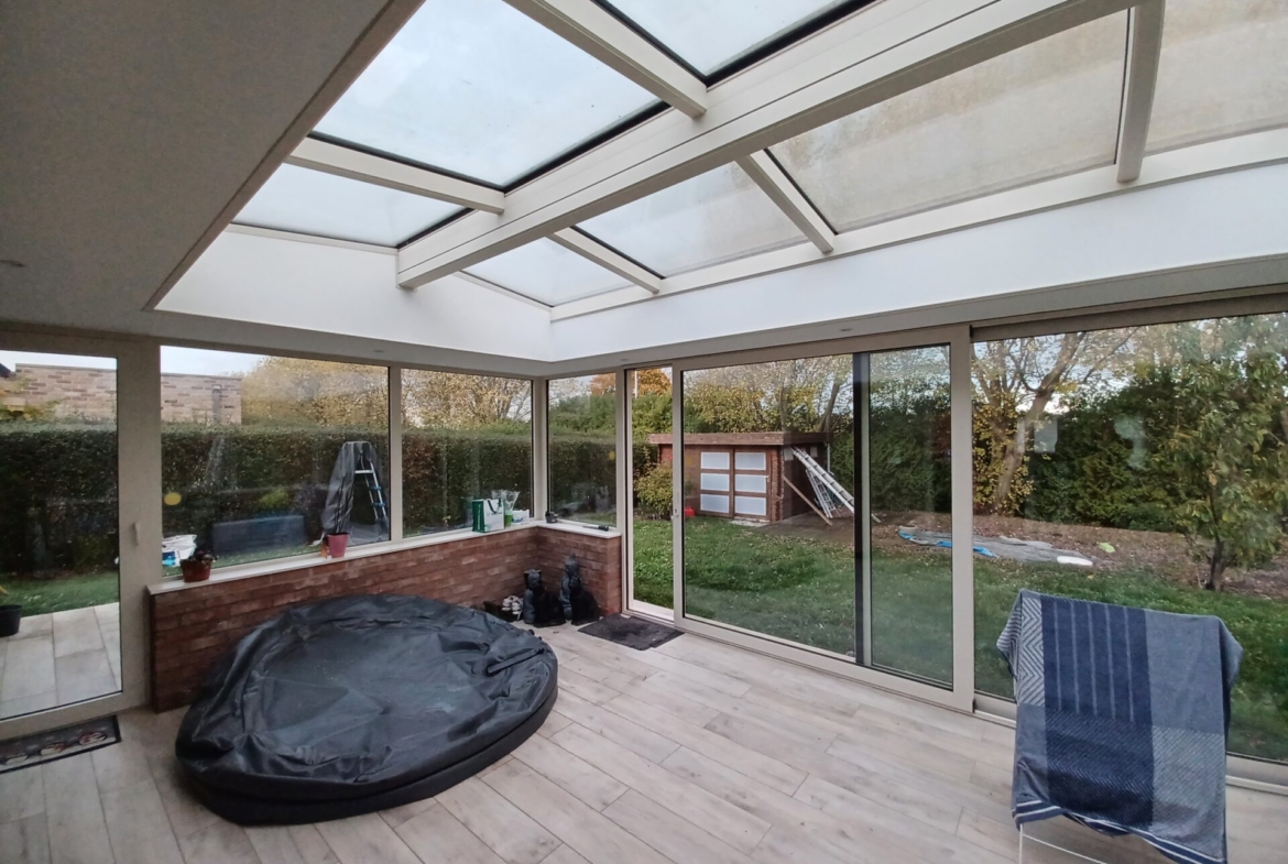 -Rez-de-chaussée : hall d’entrée avec escalier et WC, salon lumineux avec vue vers le jardin et large ouverture vers le ciel, salle-à-manger, cuisine équipée, buanderie, garage 1 voiture, grande véranda (spots encastrés).