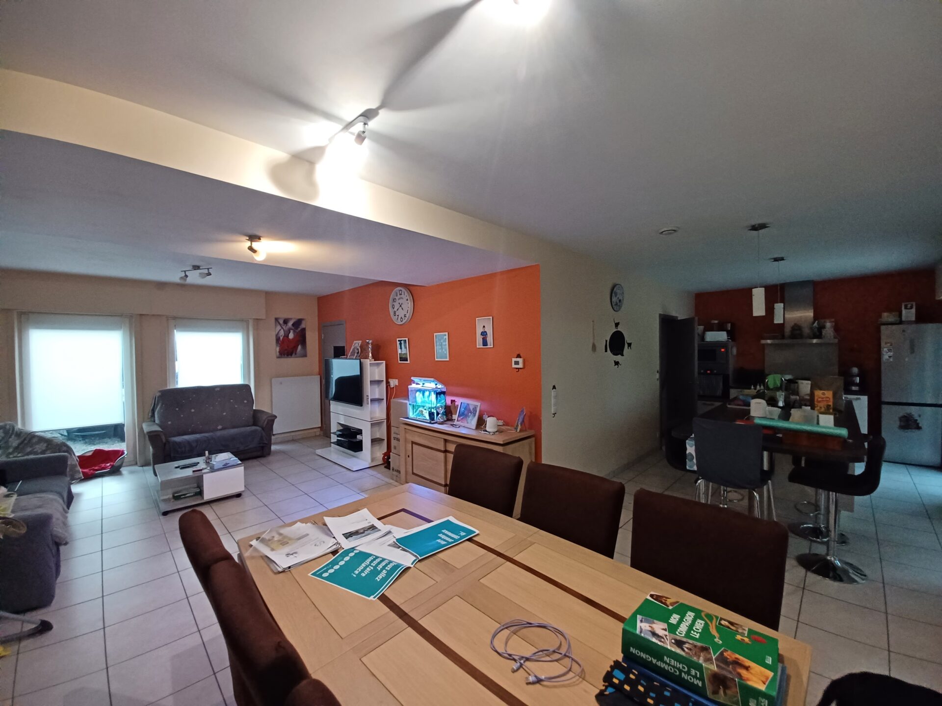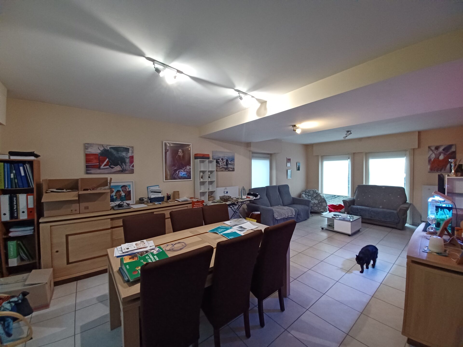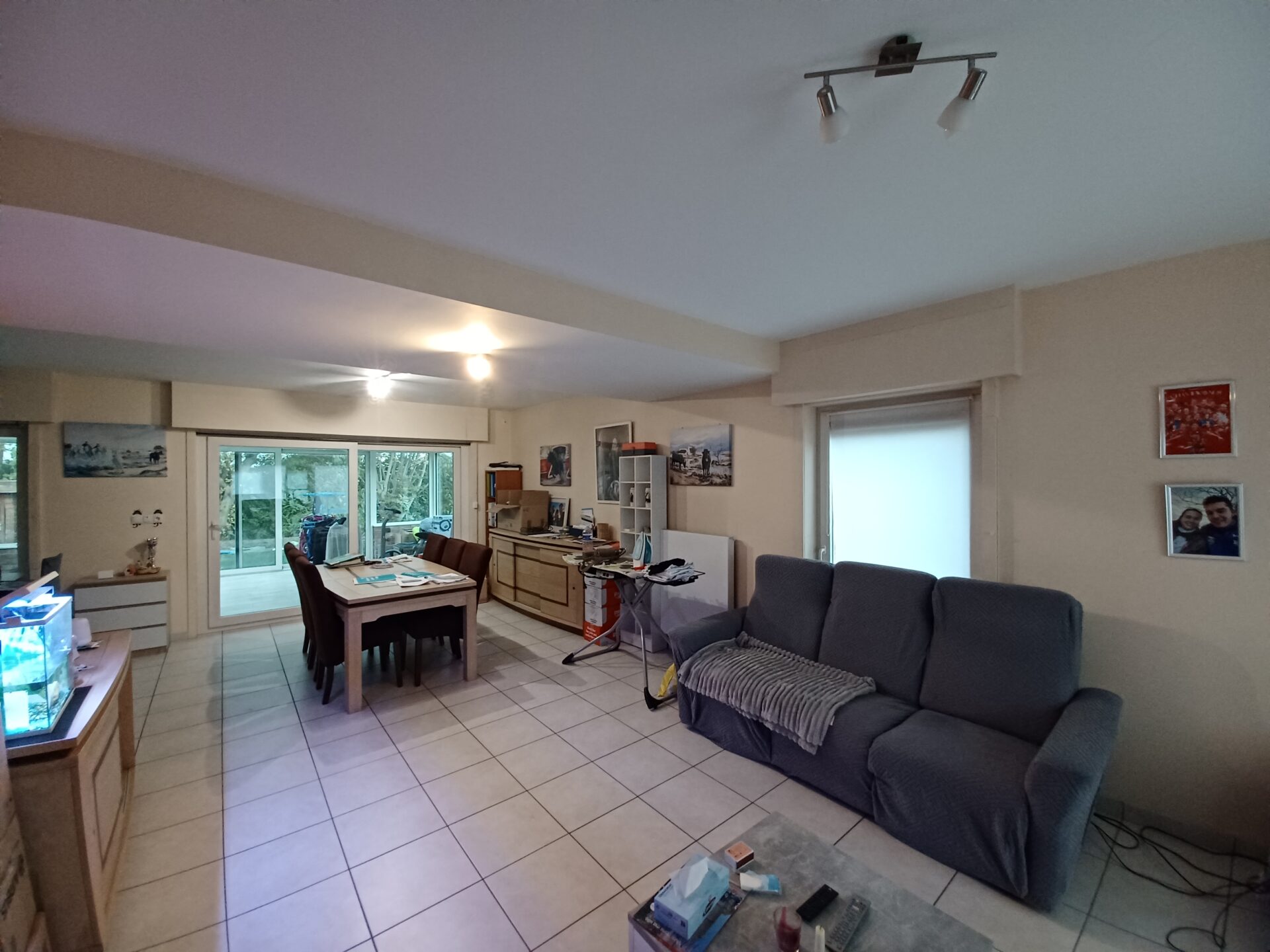 Carrelage partout au rez-de-chaussée + parquet flottant à l’étage.
