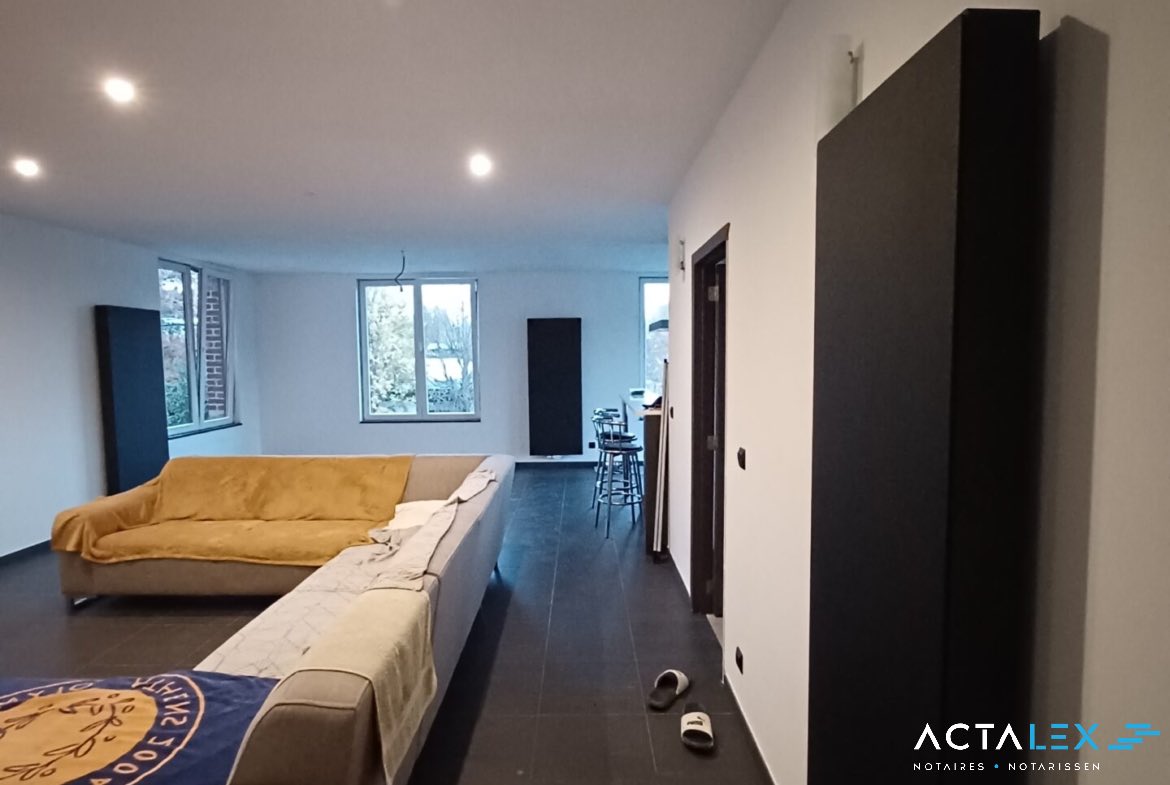 -1er étage : hall commun, hall d’entrée privatif, grand living lumineux avec baie vitrée , cuisine équipée ouverte avec bar, hall de nuit, salle de bain, wc, 2 chambres