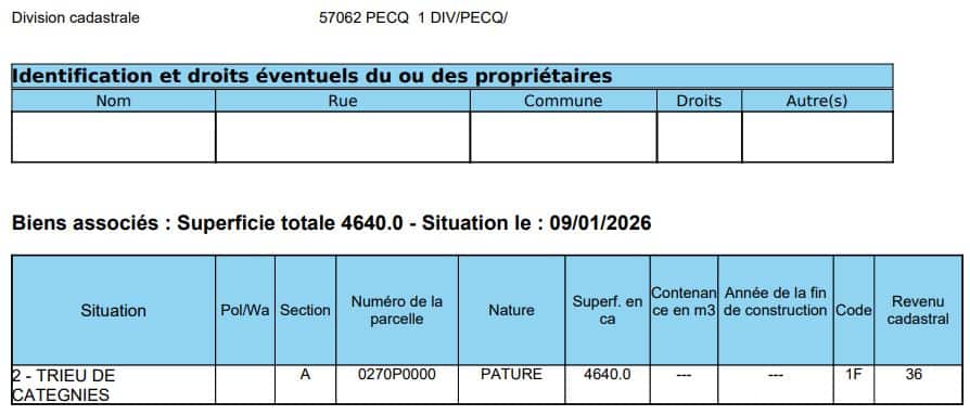 Ces parcelles, cadastrées section A numéro 0270P0000 et numéro 0365P0000 , présente une contenance cadastrale respective de 46 ares 40 centiares pour la première, et 47 ares 50 centiares pour la seconde, et un revenu cadastral non indexé respectivement de 36,00€ et 33,00€.