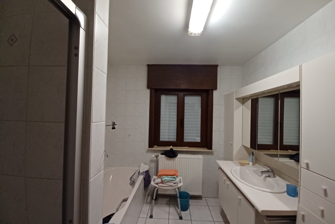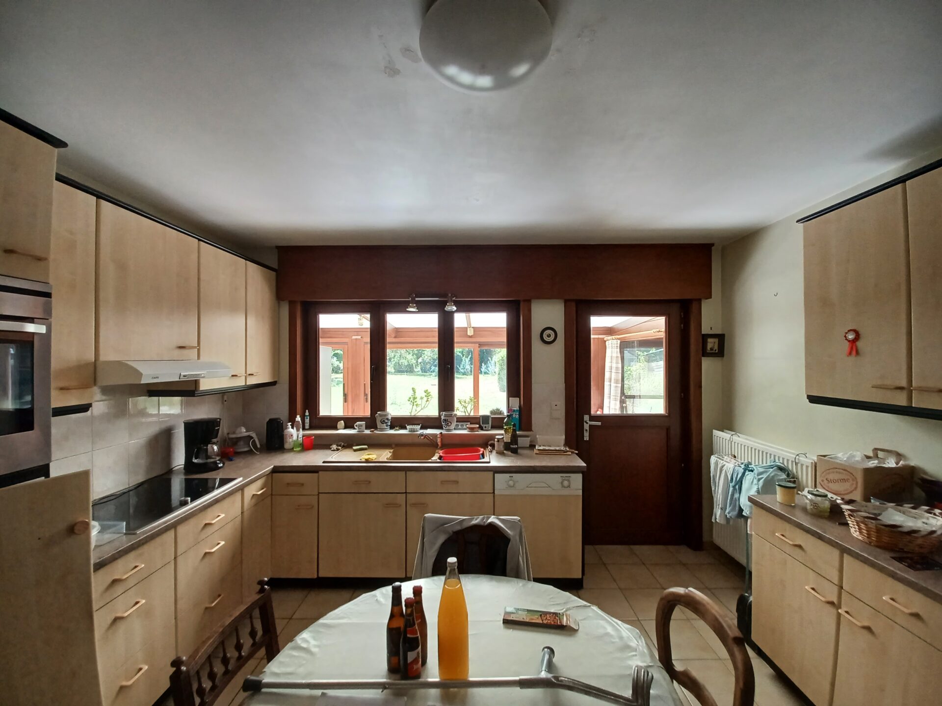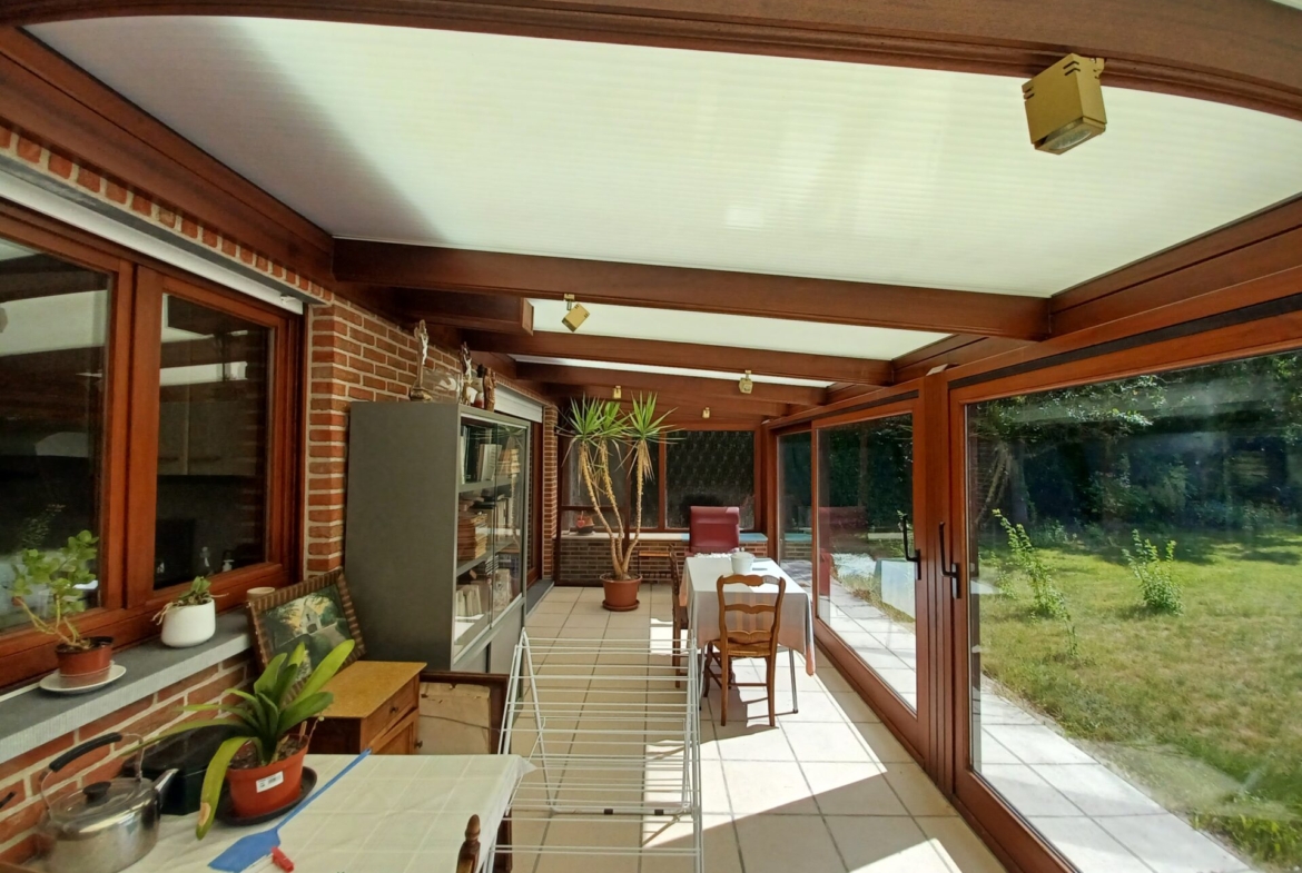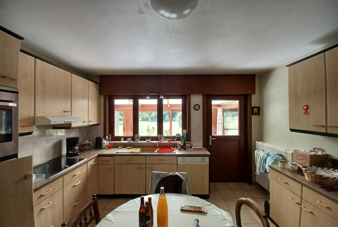 -Rez-de-chaussée : hall d’entrée avec wc et escalier, salon (vue vers le jardin), salle à manger, cuisine équipée (vue vers le jardin), salle de bain (baignoire, douche, lavabo), 1 chambre, véranda, garage/buanderie (porte sectionnelle motorisée – sortie vers le jardin).