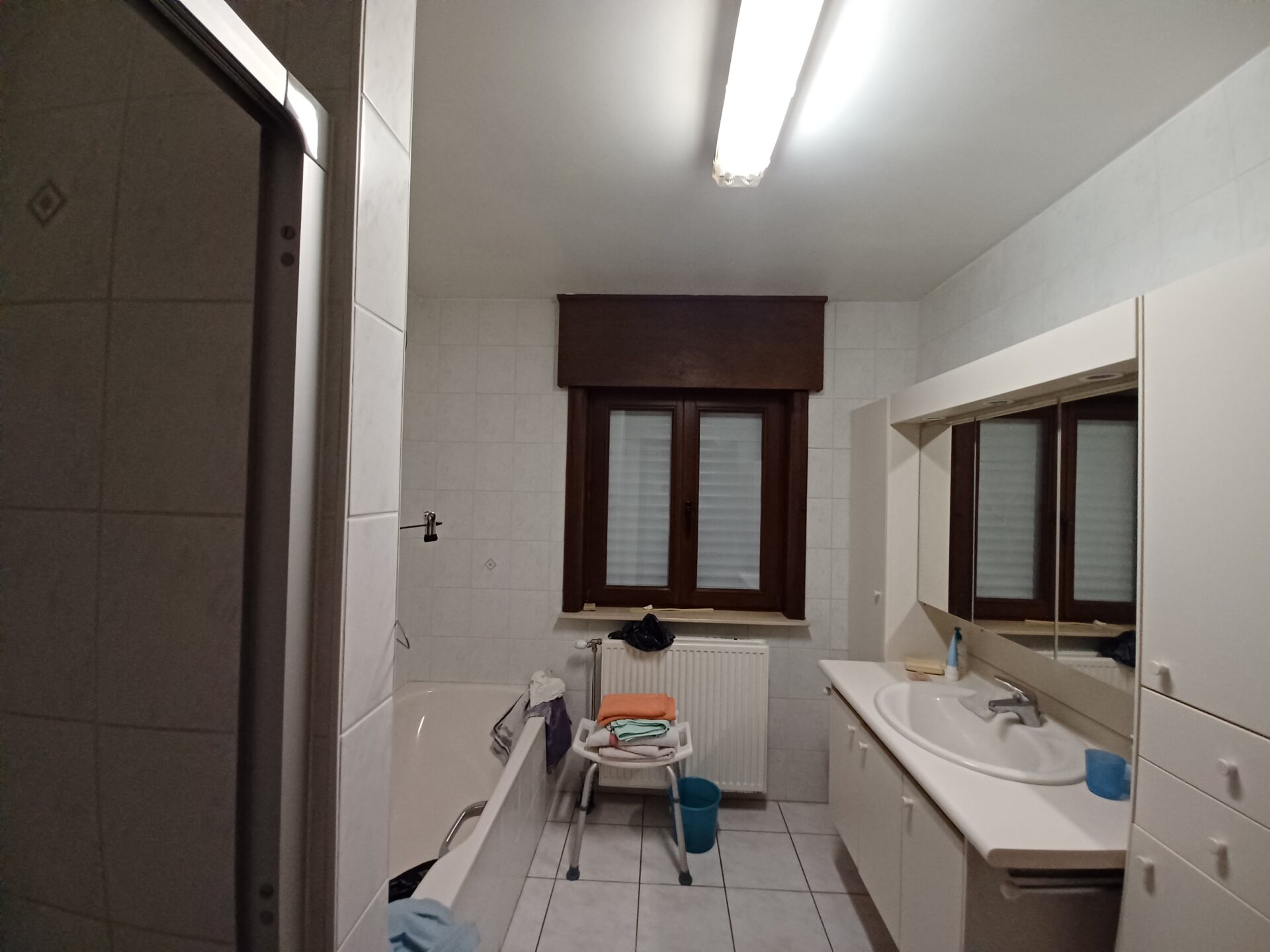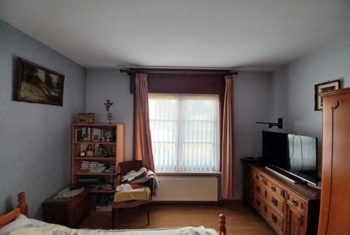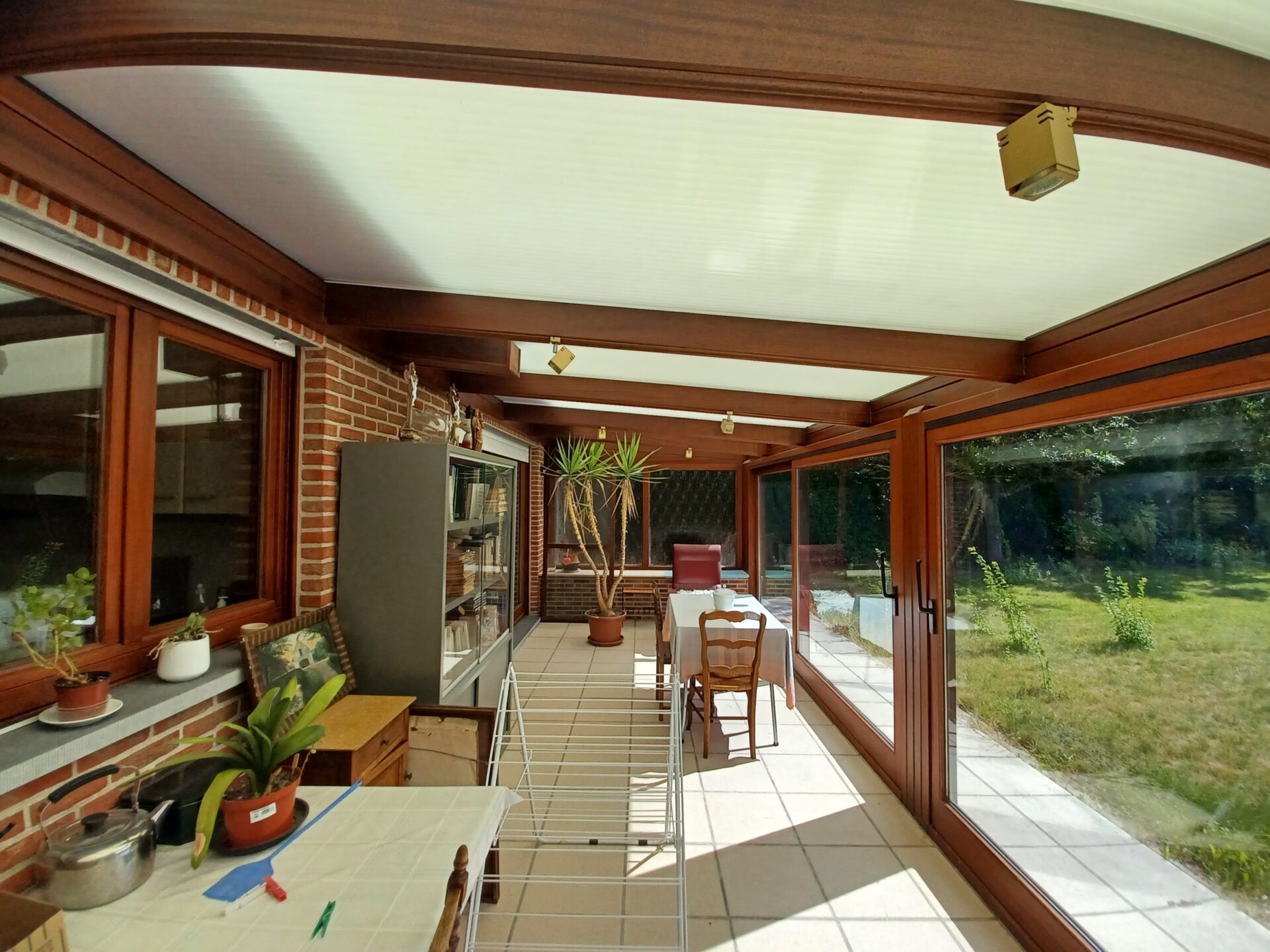 -Rez-de-chaussée : hall d’entrée avec wc et escalier, salon (vue vers le jardin), salle à manger, cuisine équipée (vue vers le jardin), salle de bain (baignoire, douche, lavabo), 1 chambre, véranda, garage/buanderie (porte sectionnelle motorisée – sortie vers le jardin).